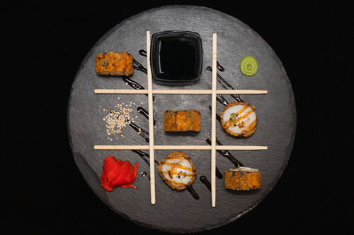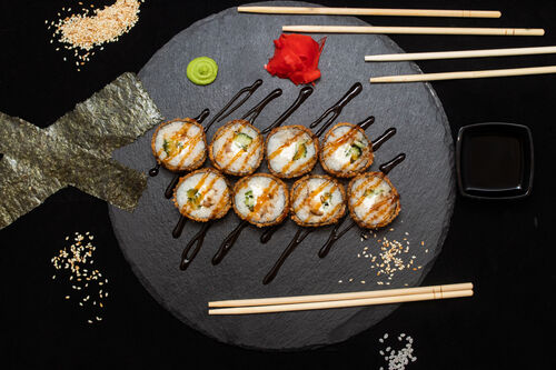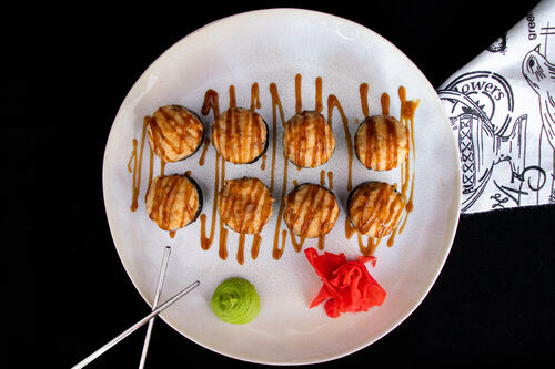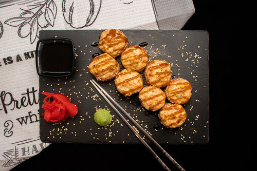 Это изысканное блюдо японской кухни, состоящее из роллов с рисом, нори и креветкой. Поливается соусом терияки. Роллы обжариваются до золотистой корочки, что придает им особый вкус и текстуру. Это блюдо отлично подходит как закуска или основное блюдо на обед или ужин. Отдаётся без комплекта соевого соуса, имбиря, васаби.