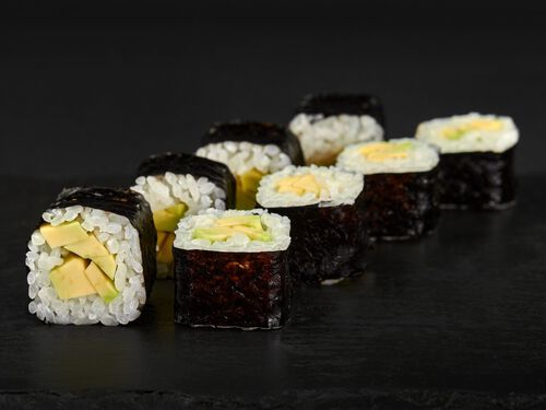 Маки с авокадо - это классическое японское блюдо, состоящее из роллов, приготовленных из риса, нори и начинки из авокадо. Это блюдо отличается нежным вкусом авокадо, сочной текстурой и аппетитным внешним видом. Отдаётся без комплекта соевого соуса, имбиря, васаби.