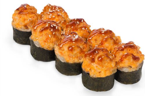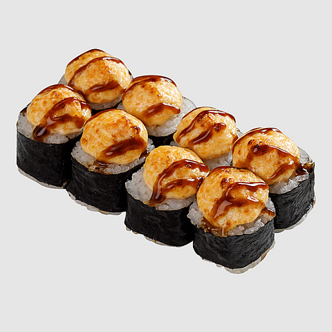 Маки с крабом запеченный - это изысканное блюдо японской кухни, состоящее из роллов, приготовленных из свежего риса, ломтиков краба, завернутых в лист водорослей нори. Поливаются соусом терияки. Затем роллы запекаются в духовке до золотистой корочки, что добавляет им особый вкус и аромат. Отдаётся без комплекта соевого соуса, имбиря, васаби.