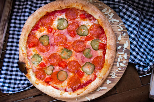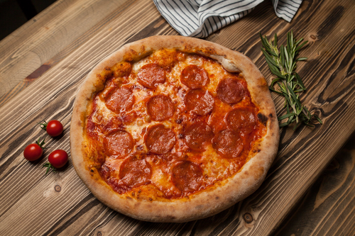 Оригинальная пицца на тонком итальянском тесте на красном соусе и пикантными пепперони