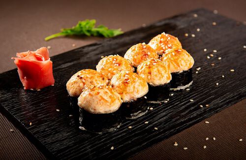 Запеченный ролл с креветкой - это вкусное блюдо японской кухни, состоящее из ролла, в котором внутри находится креветка, а сверху покрытый слоем кунжута и запеченный до хрустящей корочки. Этот ролл сочетает в себе нежный вкус креветки и аромат запеченного кунжута, создавая неповторимое гастрономическое удовольствие.