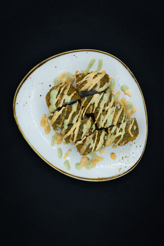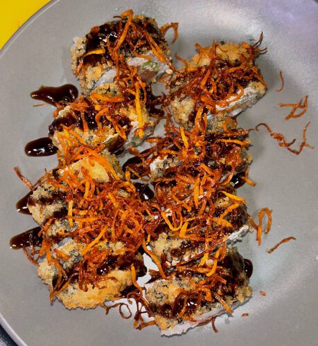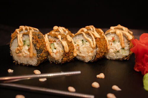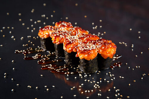 Темпура снежный краб - это изысканное блюдо японской кухни, состоящее из кусочков мяса снежного краба, огурца обваленных в панировочных сухарях и обжаренных во фритюре. Подается политым спайси соусом. Это блюдо отличается нежным вкусом и хрустящей текстурой, идеально подходит как закуска или основное блюдо.