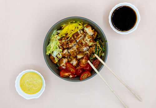 Поке с курицей в панировке — это вкусное и сытное блюдо, в основе которого лежит свежий рис, покрытый хрустящей курицей в панировке. Оно дополнено яркими овощами, такими как авокадо, огурцы и черри, а также заправлено соусом манго и терияки, которые придают блюду уникальный вкус. Идеально подходит для любителей здорового питания и японской кухни, это поке станет отличным выбором для обеда или ужина.