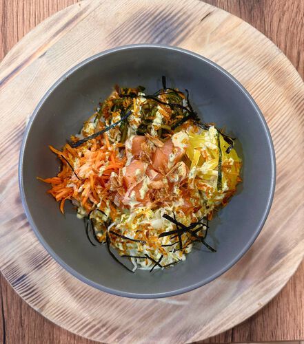 Поке с лососем NEW — это свежий и питательный салат, приготовленный по традиционному гавайскому рецепту. В его состав входят нежные кусочки лосося, авокадо, морковь по-корейски, огурчики теремки. В дополнении идут листья айсберга и редька дайкон, что делает его идеальным выбором для любителей здорового питания. Подается с имбирным и спайси соусом, создавая гармоничное сочетание вкусов. Отлично подходит как для обеда, так и для легкого ужина.
