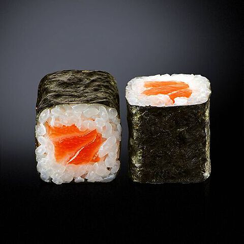 Маки с лососем - это изысканное блюдо японской кухни, состоящее из роллов с рисом и лососем завернутых в нори. Лосось придает этому блюду нежный вкус и аромат. Отдаётся без комплекта соевого соуса, имбиря, васаби.